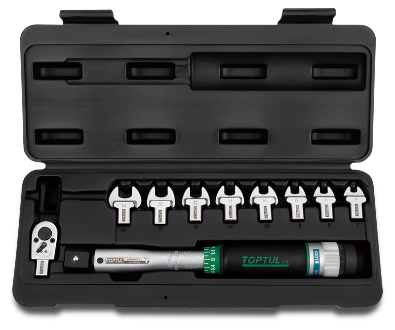 Ключ динамометрический 9x12мм 6-30 Нм с рожковыми насадками 7-14 мм 10 предметов TOPTUL