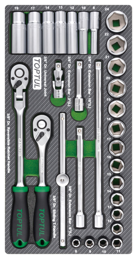 Приобрести Набор головок и аксессуаров 3/8", 30 пр. в мягком ложементе TOPTUL GEA3005 от компании Toptul (Тайвань) из раздела Торцевые головки по цене 10 425 рублей.